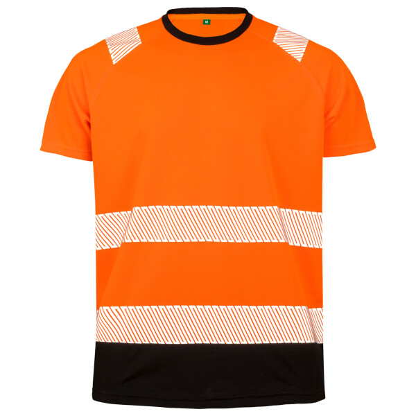 100% recycled polyester. Conforms to EN ISO 20471: 2013 + A1: 2016 class 2. RIS-3279-TOM class 2 (orange only). Quick drying and breathable. Black standard polyester stretch ribbed collar. Taped neck. Raglan sleeves with top stitch detail. Two printed reflective bands around the body and one on each shoulder. Contrast lower body panel. Tag free.