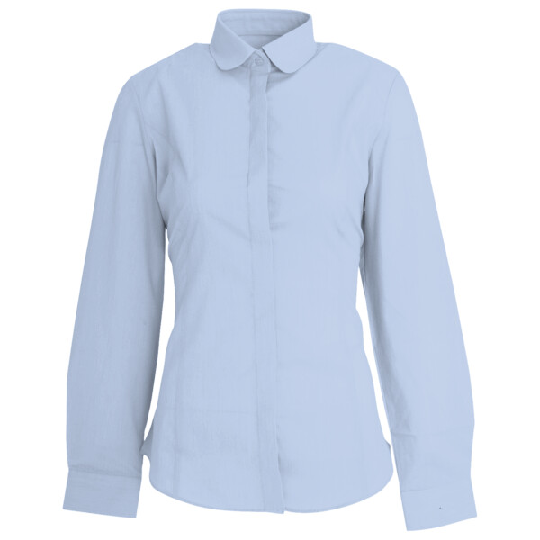 57% polyester/39% cotton/4% elastane. Easy care stretch fabric. Semi-fitted. Rounded collar. Concealed placket. Princess seams. Back yoke. Single button cuffs. Curved hem. Available in short sleeve BK133.
