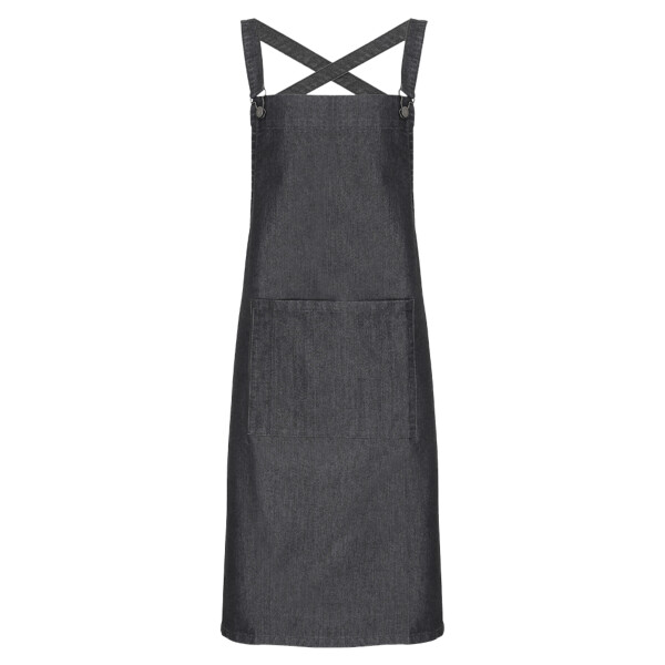 70% cotton/30% polyester. Dungaree style buckle closure. Large metal eyelets. Front pocket with pen pocket. Self fabric straps. Width 72cm. Length 86cm. Industrial laundry at 85°C. Domestic wash at 60°C.