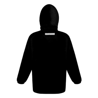 PVC coated StormDri 4000 polyester outer. In transition to using recycled polyester. Pill resistant polyester fleece lining. In transition from being reversible, to being fleece lined. Waterproof with taped seams. Windproof. Concealed hood with tear release adjuster. Full length zip with studded storm flap. Two front zip pockets on each side with storm flaps. Reflective hanging loop. Elasticated cuffs. Cut out label. Snap closing access for decoration.
