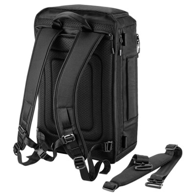 1000D twist weave polyester. Water and abrasion resistant fabric. HD polyester lining. High density seatbelt webbing. Grab handle. Innovative strap system converts from backpack to shoulder bag. Padded adjustable shoulder straps. Adjustable chest strap with clasp closure. Breathable padded mesh back panel. Main zip compartment. External secure padded laptop compartment compatible up to 15.6". Internal elastic bottle holder. Side zip pocket for bottle/umbrella. Easy access side pockets. Tear out label. Capacity 28 litres.
