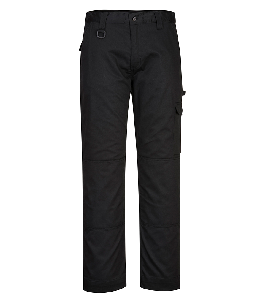 65% polyester/35% cotton kingsmill fabric. UPF rating of 50+. Part elasticated waistband. Belt loops. D-ring. Zip fly with button over. Two side pockets. Two rear pockets with button down flaps. Two side leg pockets. Ruler pocket. Knee pad pockets. Adjustable leg length reg 31" to tall 33".