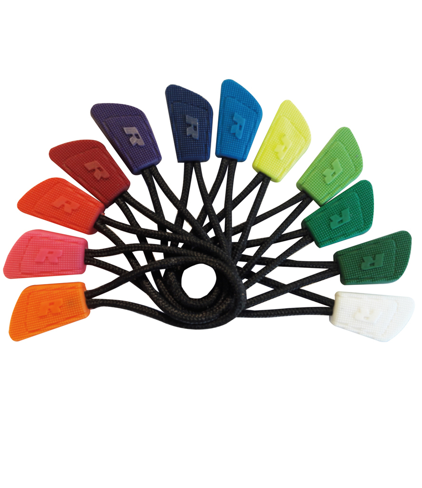 Polyurethane tag with polyester tie. Black cord.Coloured branded tag.Co-ordinates with any Result zip pull style.Sold in packs of 10.