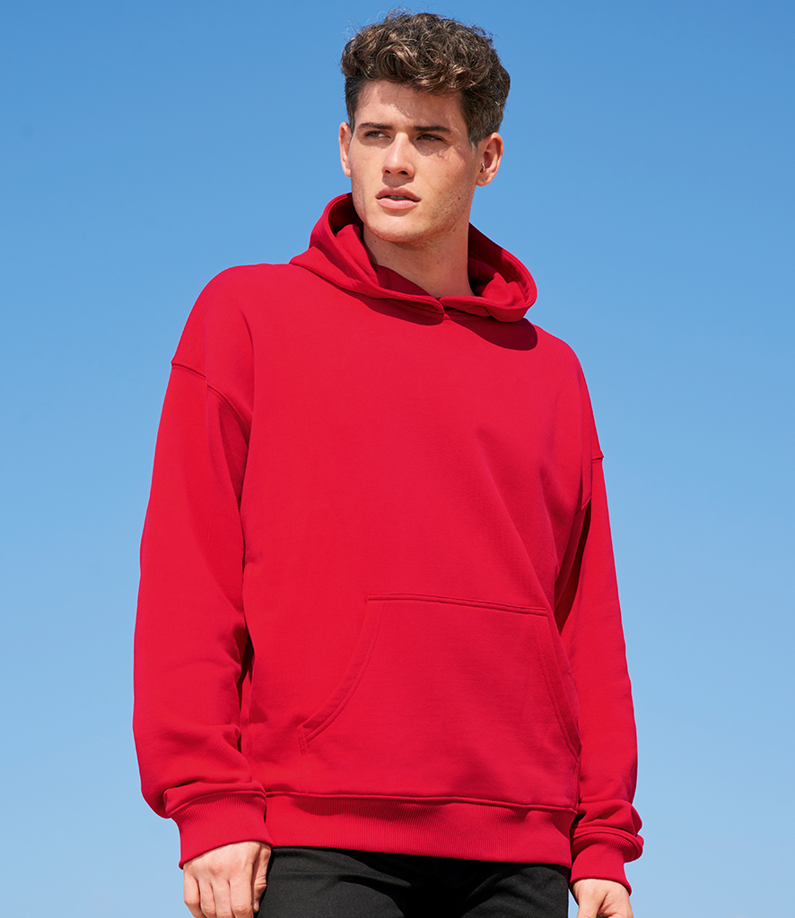 100% cotton french terry. Drop shoulder style. Oversized fit. Double fabric hood. Taped neck. Front pouch pocket. Ribbed cuffs and hem. Unbranded size label at neckline.