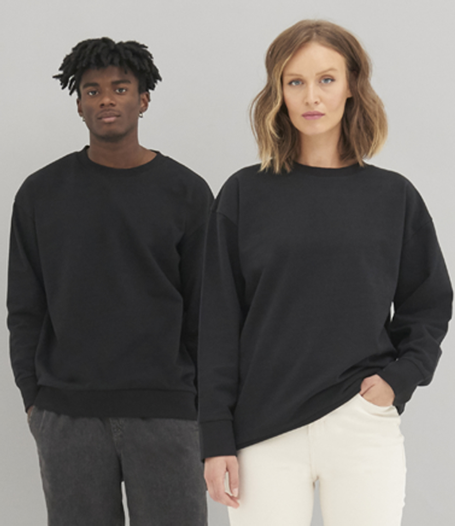 70% recycled cotton/30% recycled polyester. Peached finish. Brushed back fleece. Relaxed fit. Drop shoulder style. Ribbed collar, cuffs and hem. Unbranded size label. Recycled cotton is made from 100% pre-consumer waste.