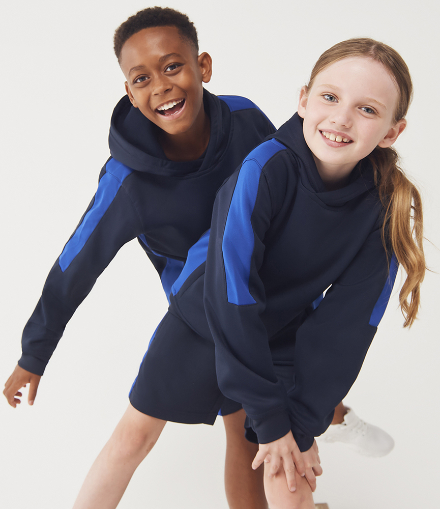 100% polyester interlock. Elasticated waistband with fixed inner drawcord.Two side zip pockets.Contrast side panels (black and navy are self colour).Twin needle stitching.Tear out label.