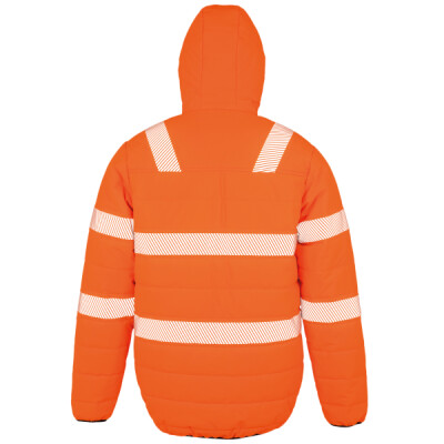 Recycled abrasion resistant ripstop polyester outer with TPU coating. Repreve® recycled polyester padding. Grey recycled polyester lining. Conforms to EN ISO 20471: 2013 + A1: 2016 class 2. RIS-3279-TOM class 2 (orange only). Navy only provides enhanced visibility. Showerproof, windproof and breathable. Grown on padded hood with bound opening. Full length YKK zip with chin guard. Two printed reflective bands around the body, sleeves and one on each shoulder. Hanging loop. Inner pocket. Two front zip pockets. Shaped longer back panel. Elasticated bound cuffs and hem. Tag free. Access for decoration.