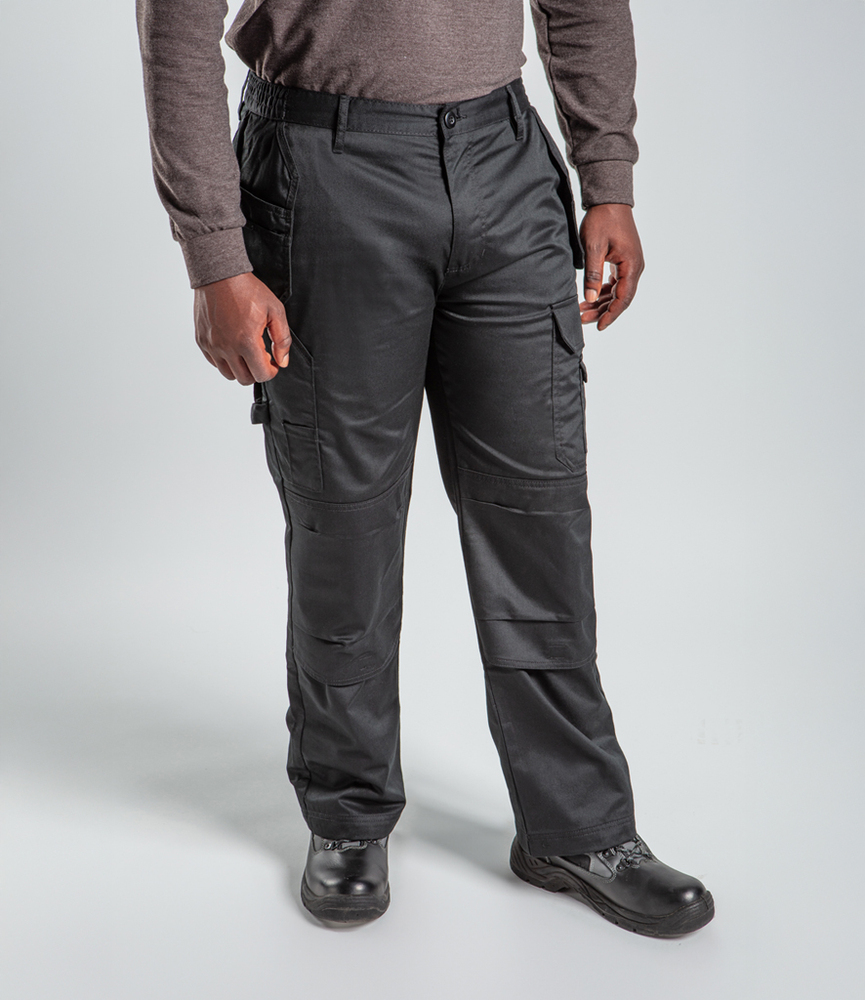 Part elasticated waistband with belt loops. Zip fly with stud over. Two front tradesman pockets. Two side pockets. Rear patch pockets. Two multi-use side leg cargo pockets.