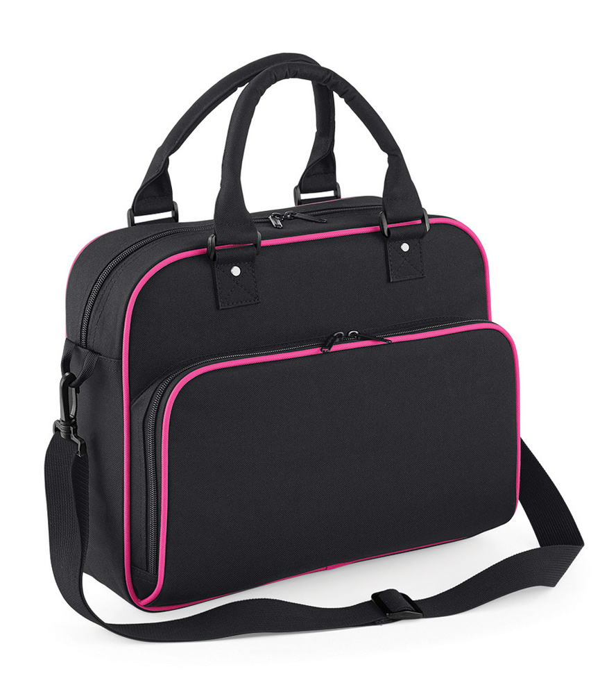 600D polyester. Self fabric carry handles. Detachable adjustable shoulder strap. Main zip compartment. Front zip pocket. Internal mesh pocket. Internal baseboard. Contrast piping. Capacity 15 litres.