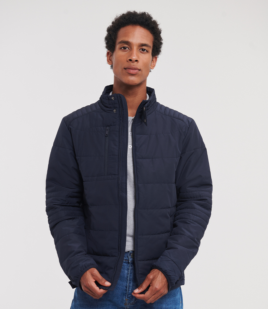 Polyester outer and lining. Eco-efficient DuPont™ Sorona® padding. Aquapel by Nanotex® DWR treatment. Windproof and breathable. Contemporary shaped fit. Stand up collar with stud closure. Collar high full length covered zip with inner zip guard. Right chest zip pocket. Inner zip pocket. Two front zip pockets. Zips on lower sleeves with stud flap. Self colour bound cuffs. Access for decoration. Branded cuffs and zip pulls.