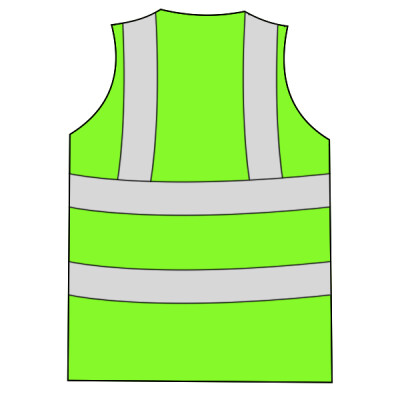 100% polyester. Conforms to EN 1150: 1999 (yellow and orange only). Self colour bound edges. Tear release front closure. Two reflective bands around the body and one over each shoulder.
