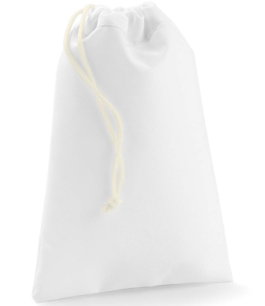 300D polyester. Drawcord closure. Removable cord for ease of decoration. Can be decorated front and rear. Tear out label.