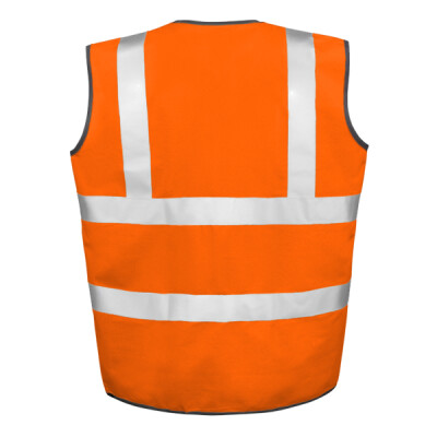 100% polyester. Conforms to EN ISO 20471: 2013 + A1: 2016 class 2. RIS-3279-TOM (orange only). Polyester bound edges. Tear release front closure. Two 3M™ reflective bands around the body and one over each shoulder. Sized to be worn as an over garment.