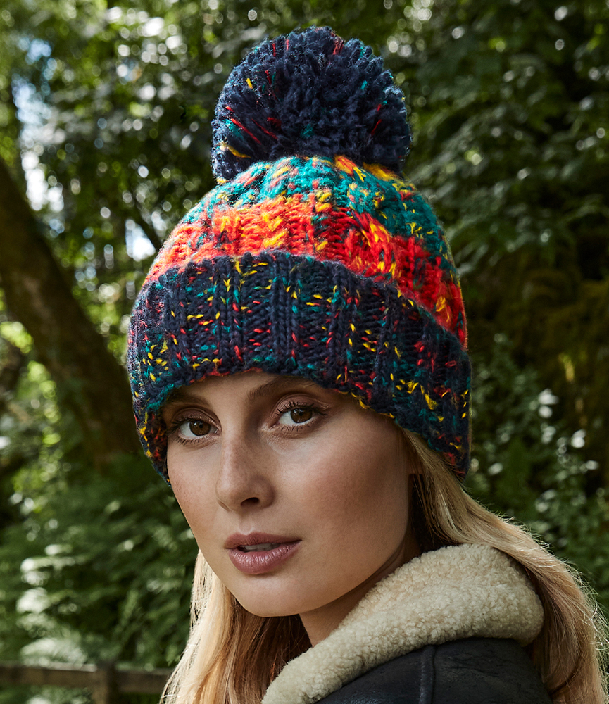 100% soft spun acrylic. Heavy multi-yarn cable knit design. Bold four colour stripe design. Shearling thermal band for extra warmth. Cuffed design. Tear out label.