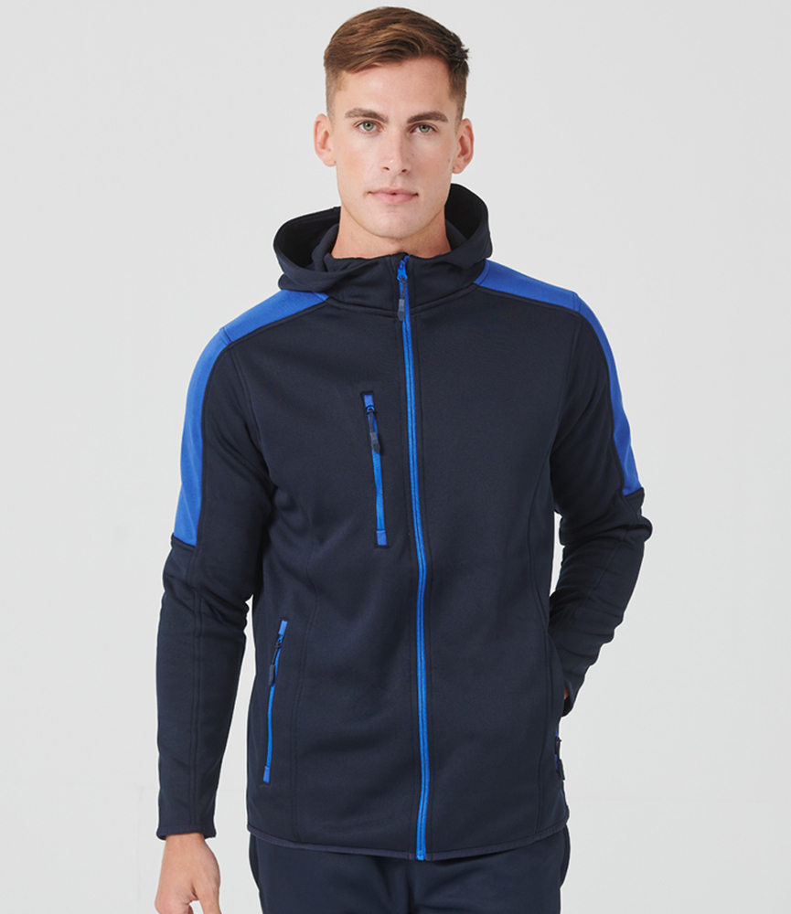 Two layer soft shell. 100% polyester. Soft jersey fabric with bonded micro fleece reverse. Three panel hood. Contrast shoulders and upper sleeve panels. Full length contrast zip with non-slip gripper zip pulls. Contrast right chest and two front zip pockets. Top stitched side panels. Stretch bound cuffs and hem. Drop hem.