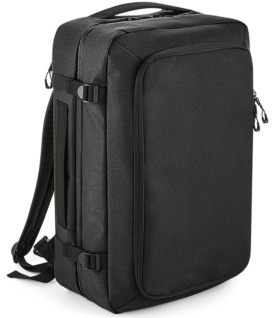 600D polyester. Aircraft cabin compatible. Padded grab handles. Foldaway backpack shoulder straps. Dual compartment design. Dual compression straps. Lockable main zip compartment. Quick access top zip pocket. Large front zip compartment with internal mesh divider. Internal zip pocket. Organiser section. Padded laptop sleeve compatible up to 15.6". Tear out label. Capacity 40 litres.