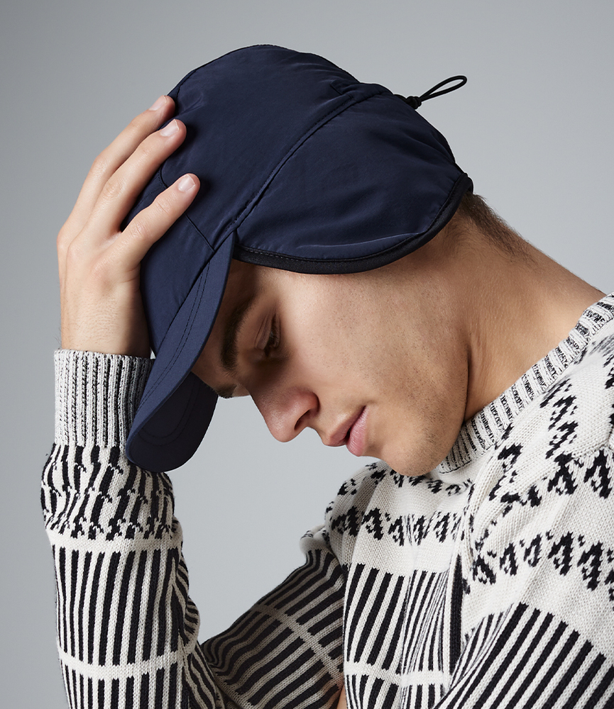 100% nylon taslon outer. 100% polyester Suprafleece® lining. Waterproof and breathable fabric. 5 panel. Taped seams. Pre-curved peak. Optional fold down earflaps. Elasticated size adjuster.