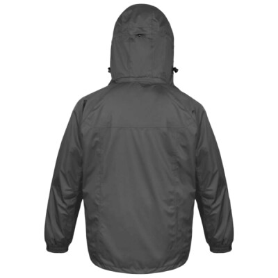 100% polyester ripstop outer. Outer jacket is waterproof 3000mm with taped seams, breathable 3000g and windproof. Detachable, adjustable lined hood with reflective peak. Full length two way zip. Tear release outer double storm flap with studs. Right chest pocket. Two front pockets. Elasticated cuffs with tear release adjuster. Adjustable drawcord hem. Removable two layer black soft shell jacket. Inner jacket has a full length zip. Inner and front side pockets. Plain cuffs. Cut out label. Access for decoration on outer jacket.