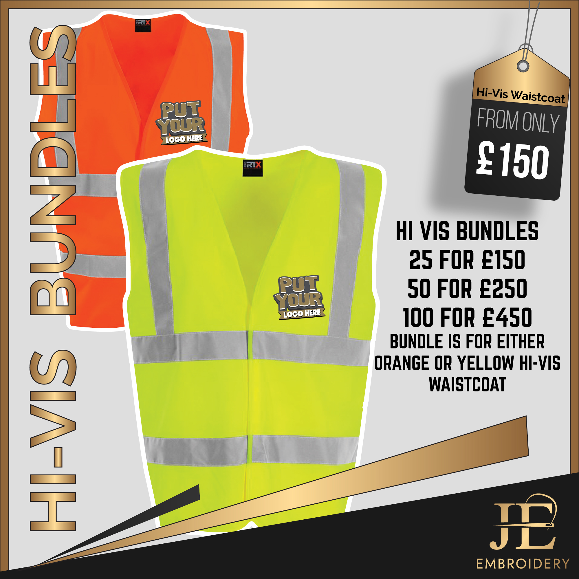 Hi Vis bundle option minimum order is 25 but the more you order the cheaper they will be. jest select the colour required and fill in the details below. we will send a proof before we do any printing. if you are having issues uploading logos please email them to info@jeembroidery.com.