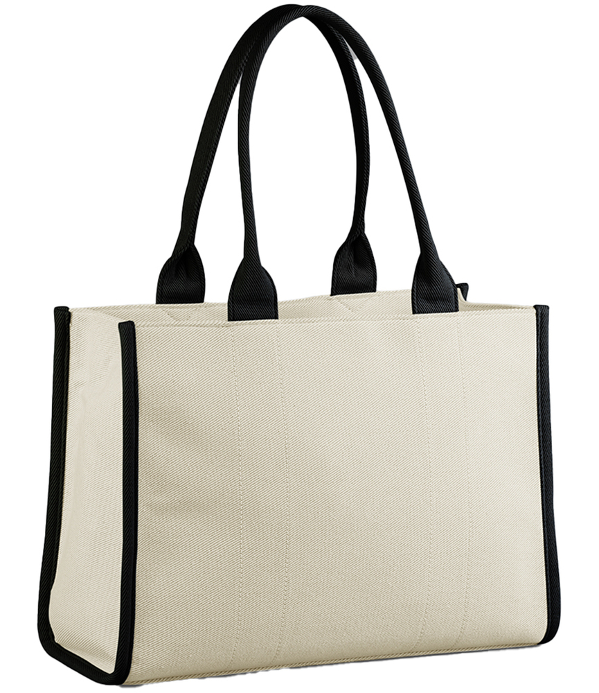 66% polyester/23% cotton/11% other fibres. Premium twill fabric.Recycled polyester soft touch lining.Contrast carry/shoulder straps (59cm long), natural is self colour.High shine gold metal trims.Internal baseboard.Tear out label.Capacity 20 litres.Concealed zip in lining for decoration.